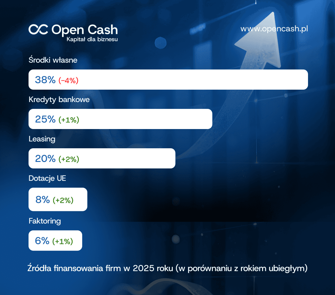 Środki własne przestają pełnić rolę uniwersalnego rozwiązania i są coraz częściej wykorzystywane jako punkt startowy do uruchamiania kolejnych źródeł kapitału. Leasing przejmuje funkcję podstawowego narzędzia inwestycyjnego, kredyty bankowe stabilizują strukturę przy większej skali działalności, a faktoring odpowiada za bieżącą płynność i bezpieczeństwo operacyjne.
